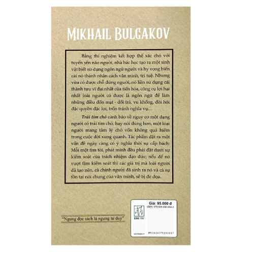 Nội dung câu chuyện kể về 1 ông bác sĩ nổi tiếng, GS Philip Philipovich Preobrazhensky đã thành công trong phẫu thuật, một thí nghiệm chưa từng có, cấy ghép và biến 1 con chó hoang tên là Sharik thành người. Kết quả vượt quá sự mong đợi – nó dần dần bắt đầu có hình dạng con người và mang cái tên người Sarikov, chỉ duy nhất còn trái tim là của loài chó!Sharikov vẫn nhớ thời nó phải làm 1 con chó, lang thang kiếm ăn và bị người ta đánh đập. Giờ nó muốn đòi lại sự “công bằng”, trả món nợ áp bức bất công trước đây. Nó bắt đầu chống lại loài người với tất cả những gì xấu xa nhất, đểu giả nhất và vô lương nhất trong tim 1 con chó. Từ săn đuổi 1 con mèo, gây gổ với nhà bên, nhậu nhẹt, gẹo gái, trộm cắp, dối trá và lừa đảo cho đến giết người. Hối hận vì đã biến 1 con chó thành người, vị giáo sư đáng kính Preobrazhensky muốn sửa chữa sai lầm… nhưng đã muộn. II. Thông Tin Chi Tiết Mã Hàng: 8936065580008 Nhà Cung Cấp: Đông Tây Tác Giả: Mikhail Bulgakov Người Dịch: Đoàn Tử Huyến Nhà Xuất Bản: NXB Lao Động Năm Xuất Bản: 2024 Ngôn Ngữ: Tiếng Việt Trọng Lượng: 278 gram Kích Thước: 12 x 20 Số Trang: 206 Hình Thức: Bìa Mềm