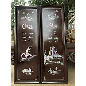 Tranh câu đối cha mẹ được làm bằng chất liệu gỗ gụ ,Kết hợp với khảm ốc đỏ tự nhiên 100% Kích thước ngang 40cm dài 120cm dầy 4cm  _ Tranh câu đối cha mẹ được khảm ốc đỏ rất tỉ mỉ tinh sảo kỳ công ,Đi hầu hết tất cả các chi tiết nội dung hoa văn ,Của đôi câu đối đều được chỉnh sửa ngọt tỉa ,hoàn bằng tay thủ công .Kết hợp với khảm ốc đỏ .Đôi câu đối được kiểm định rất kỹ lưỡng như chất lượng ốc khảm và chất lượng gỗ ,luôn luôn được sấy khô .Mục đích trống dập nứt vênh mo mối mọt .Đồng thời trà nhám đánh giấy giáp nhiều lần cho sạch sẽ ,Sờ mát lạnh ,Song cho vào nhuộm mầu gụ ,đánh bét ly làm mầu mận chin giả cổ ,Như ảnh trên ,Đôi câu đối được làm và hoàn thiện do bàn tay khối óc tài hoa ,Từ những nghệ nhân giàu kinh nghiệm cũng như tay nghề cao trong làng nghề truyền thống .Chính vì thế đôi câu đối đã đáp ứng đầy đủ những tiêu trí ( Đẹp bền rẻ ) Thẩm mỹ nghệ thuật với chất lượng tuyệt vời