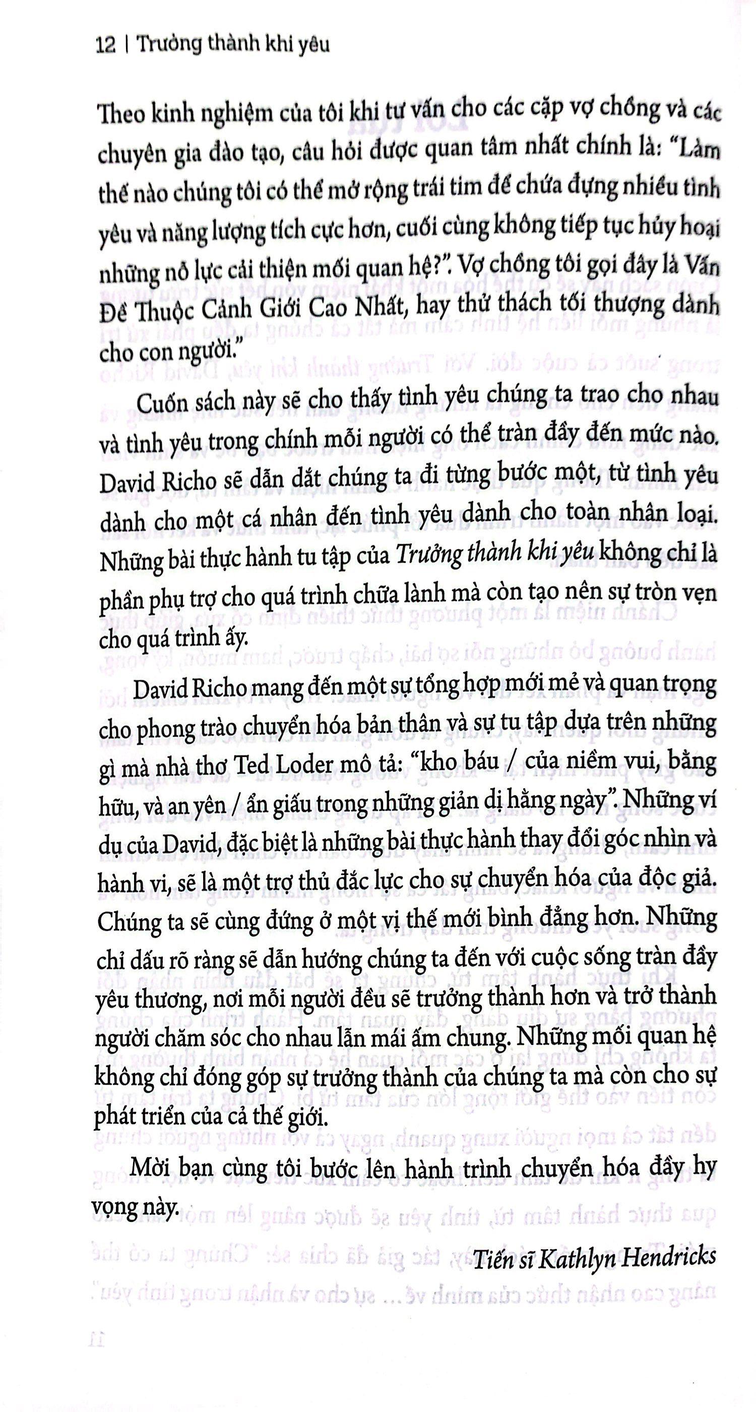 Trưởng Thành Khi Yêu Trưởng thành khi yêu cùng độc giả khám phá năm đặc tính của một tình yêu tỉnh thức và vai trò quan trọng của chúng trong các mối quan hệ. Nền tảng của một tình yêu trưởng thành chính là sự cam kết trao cho nhau những gì tác giả gọi là “Năm Chữ A”: Attention – Quan Tâm, Acceptance – Chấp Nhận, Appreciation – Trân Trọng, Affection – Yêu Thương và Allowing – Cho Phép. Với rất nhiều bài thực hành dành cho các cặp đôi và cả người độc thân, Trưởng thành khi yêu giúp người đọc hiểu sâu và có cái nhìn tích cực về hành trình yêu thương trọn đời. Với chủ đề trọng tâm là tình yêu chánh niệm, “Trưởng thành khi yêu” sẽ dành cho độc giả - người trưởng thành; người có hứng thú với chủ đề tình cảm lứa đôi, chữa lành đứa trẻ bên trong và những tổn thương từ quá khứ; người có hiểu biết cơ bản về Phật giáo Tác giả: David Richo ngoài thực hiện những công việc của một chuyên viên trị liệu tâm lý gia đình và hôn nhân, giáo viên, nhà văn, người điều phối khóa học. Tiến sĩ tâm lý học lâm sàng David Richo còn mang một sứ mệnh cao cả khác là nghiên cứu lợi ích của chánh niệm và lòng từ bi trong công cuộc phát triển cá nhân, niềm hạnh phúc trong các mối quan hệ lứa đôi. Ông cho ra đời nhiều cuốn sách, trong đó kết hợp các quan điểm tâm lý học Carl Jung, thơ ca và thần thoại với mục đích tích hợp tâm lý với duy linh. Sách và các khóa đào tạo của ông thường tập trung vào thực hành tâm linh trong Phật giáo và Ki-tô giáo. Trích đoạn sách: ĐO LƯỜNG HẠNH PHÚC | Nếu không hạnh phúc trong một mối quan hệ, bạn có thể nghĩ đó là lỗi của đối phương. Nhưng đôi khi, đó là do bản thân bạn không tin m.ình có quyền được hạnh phúc. Hãy cùng xem những dấu hiệu của một niềm tin sai lệch như vậy dưới đây. Những điều nào đúng với bạn? Dành ra ba phút để viết ra các dấu hiệu bạn từng có. Sau đó, hãy lần ngược lại các dấu hiệu ấy và viết về cách bạn sẽ áp dụng tư duy mới.