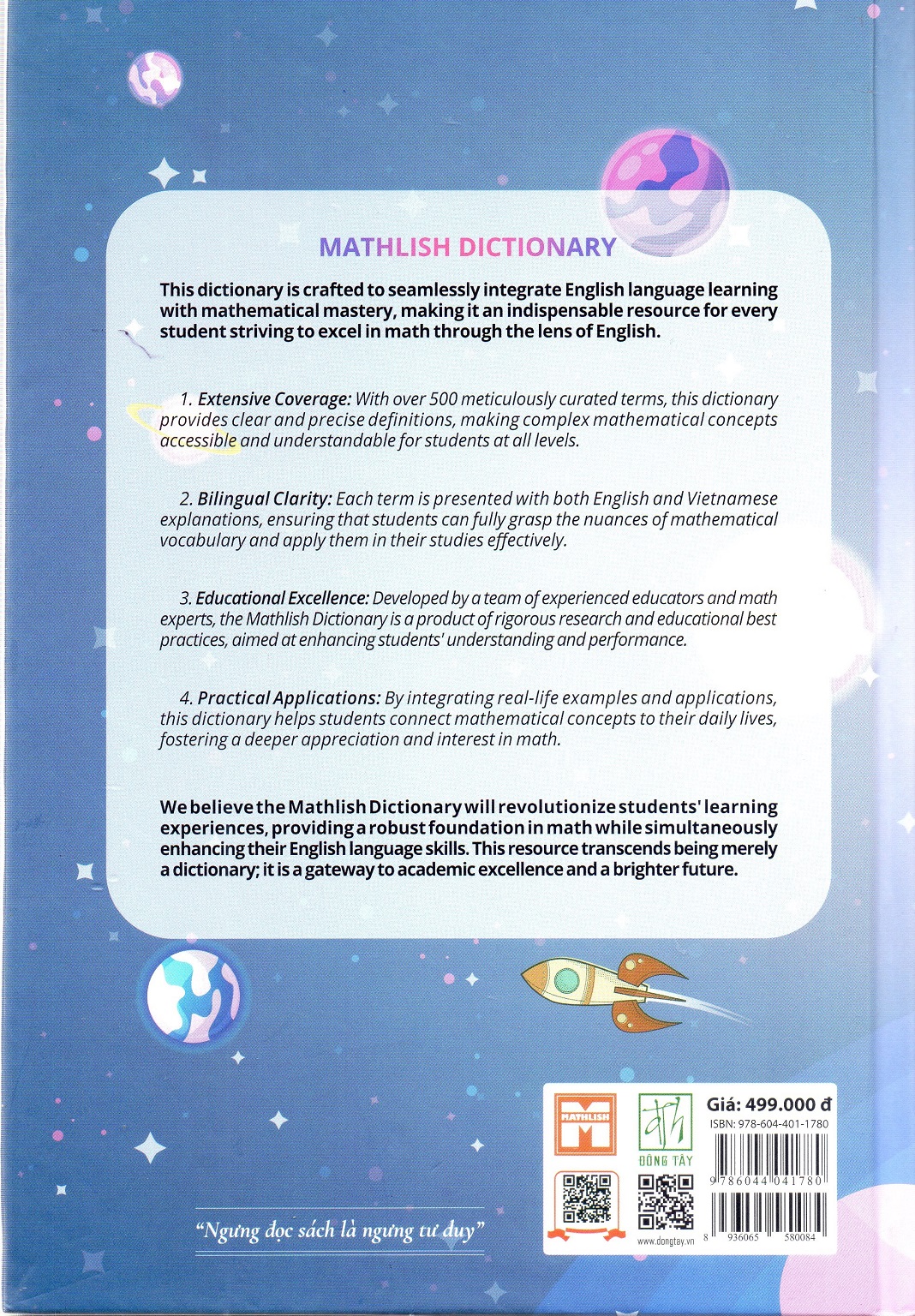Từ điển toán tiếng anh Mathlish Nhà xuất bản Dân Trí Nhà phát hành : Công Ty TNHH Văn Hóa Đông Tây Năm xuất bản : 2024 Tác giả : Trần Bình (chủ biên), Bùi Thị Thơm, Đặng Tùng Long Số trang : 287 Khổ : 16 x 24cm Trọng lượng : 1000gr Loại bìa : Bìa cứng Sách in 4 màu ISBN : 8936065580084 Cuốn từ điển này bao gồm : - Hơn 500 từ vựng và thuật ngữ toán thông dụng nhất bằng tiếng Anh - Dịch chi tiết các từ vựng và thuật ngữ sang tiếng Việt - Các từ vựng liên quan và giải thích bằng tiếng Việt - Hinh ảnh minh họa sinh động và dễ hiểu, được thiết kế bởi đội ngũ Mathlish Chúng tôi hi vọng rằng, cuốn sách sẽ là người bạn đồng hành trên hành trình chinh phục tri thức của các em học sinh. Hi vọng cuốn sách này sẽ giúp các em tự tin hơn, khám phá nhiều điều thú vị từ toán học và ngôn ngữ, đồng thời tạo nền tảng vững chắc cho tương lai