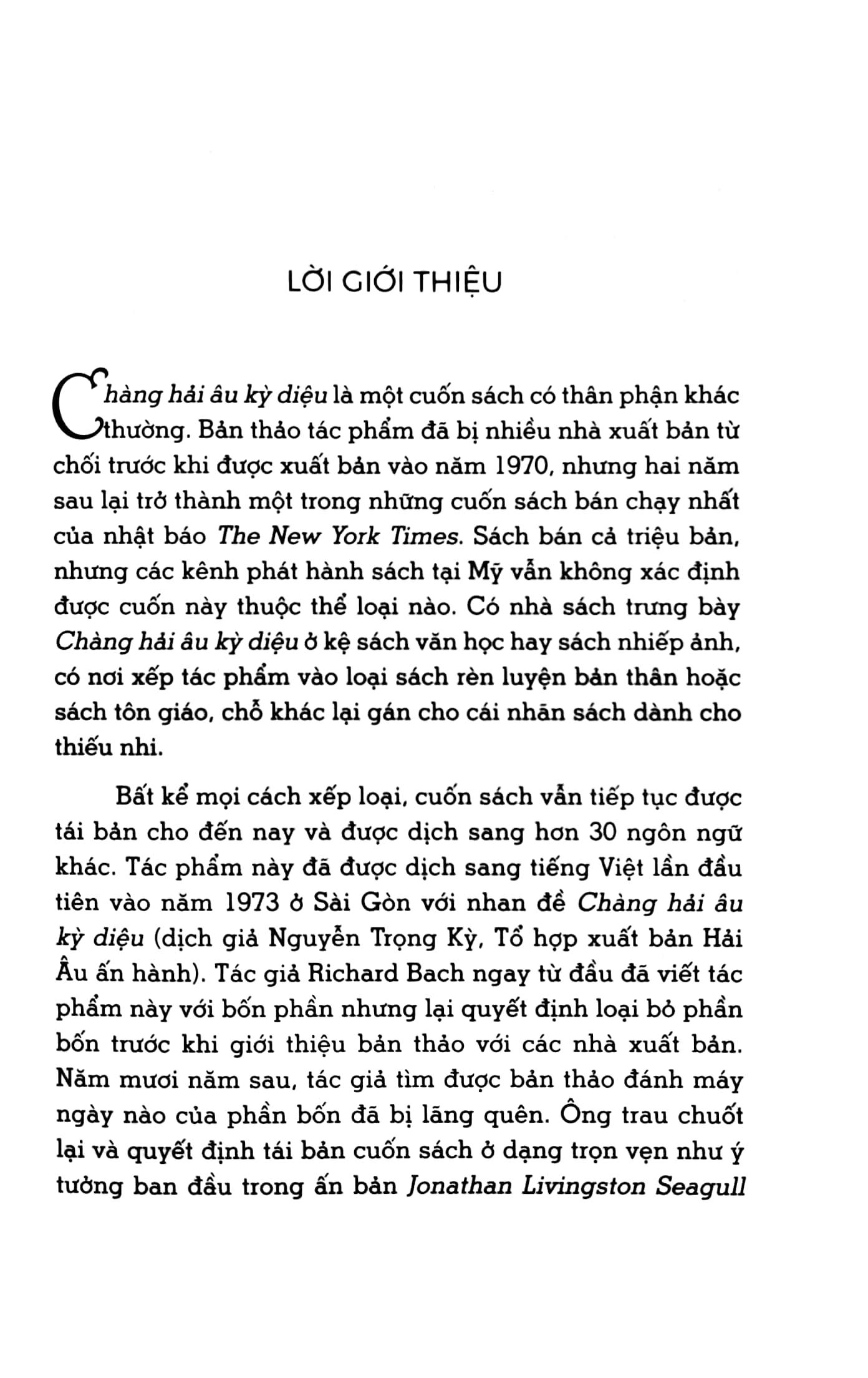 Lần đầu tiên tôi đọc "Chàng hải âu kỳ diệu" là năm mươi năm trước, lúc là một chú bé tám tuổi, qua bản dịch của Nguyễn Trọng Kỳ. Chú bé ấy đọc vì những bức ảnh trắng đen lạ lùng của nhà nhiếp ảnh Russell Munson lôi cuốn. Chú bé ấy đọc, thích thú, và không hiểu gì cả! Vì thế chú bé đọc đi đọc lại và tự tìm câu trả lời cho những thắc mắc mà cuốn sách gợi ra. Ở tuổi đó, tôi không hiểu tại sao việc khổ nhọc luyện bay cao, bay nhanh của chú hải âu Jonathan lại có ý nghĩa gì giá trị hơn việc bay tự nhiên của loài chim biển ấy. Tôi không hiểu sự khác biệt giữa “sống để bay” và “bay để sống” và tại sao chú hải âu kia lại bị hắt hủi, bị xa lánh vì đeo đuổi đam mê bay bổng của mình.