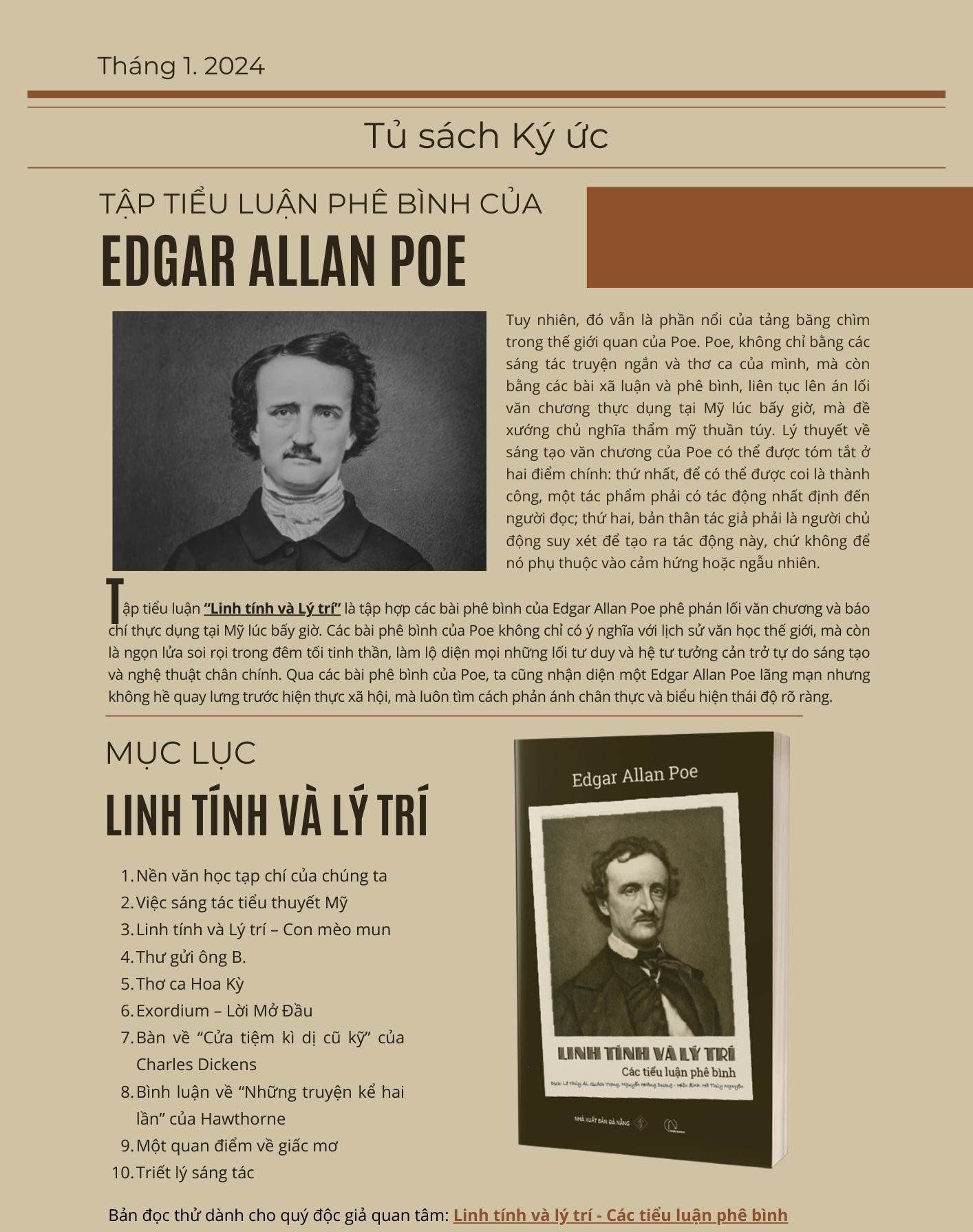 Tập tiểu luận “Linh tính và Lý trí” là tập hợp các bài phê bình của Edgar Allan Poe phê phán lối văn chương và báo chí thực dụng tại Mỹ lúc bấy giờ. Các bài phê bình của Poe không chỉ có ý nghĩa với lịch sử văn học thế giới, mà còn là ngọn lửa soi rọi trong đêm tối tinh thần, làm lộ diện những lối tư duy và hệ tư tưởng cản trở tự do sáng tạo và nghệ thuật chân chính. Qua các bài phê bình của Poe, ta cũng nhận diện một Edgar Allan Poe lãng mạn nhưng không hề quay lưng trước hiện thực xã hội, mà luôn tìm cách phản ánh chân thực và biểu hiện thái độ rõ ràng.