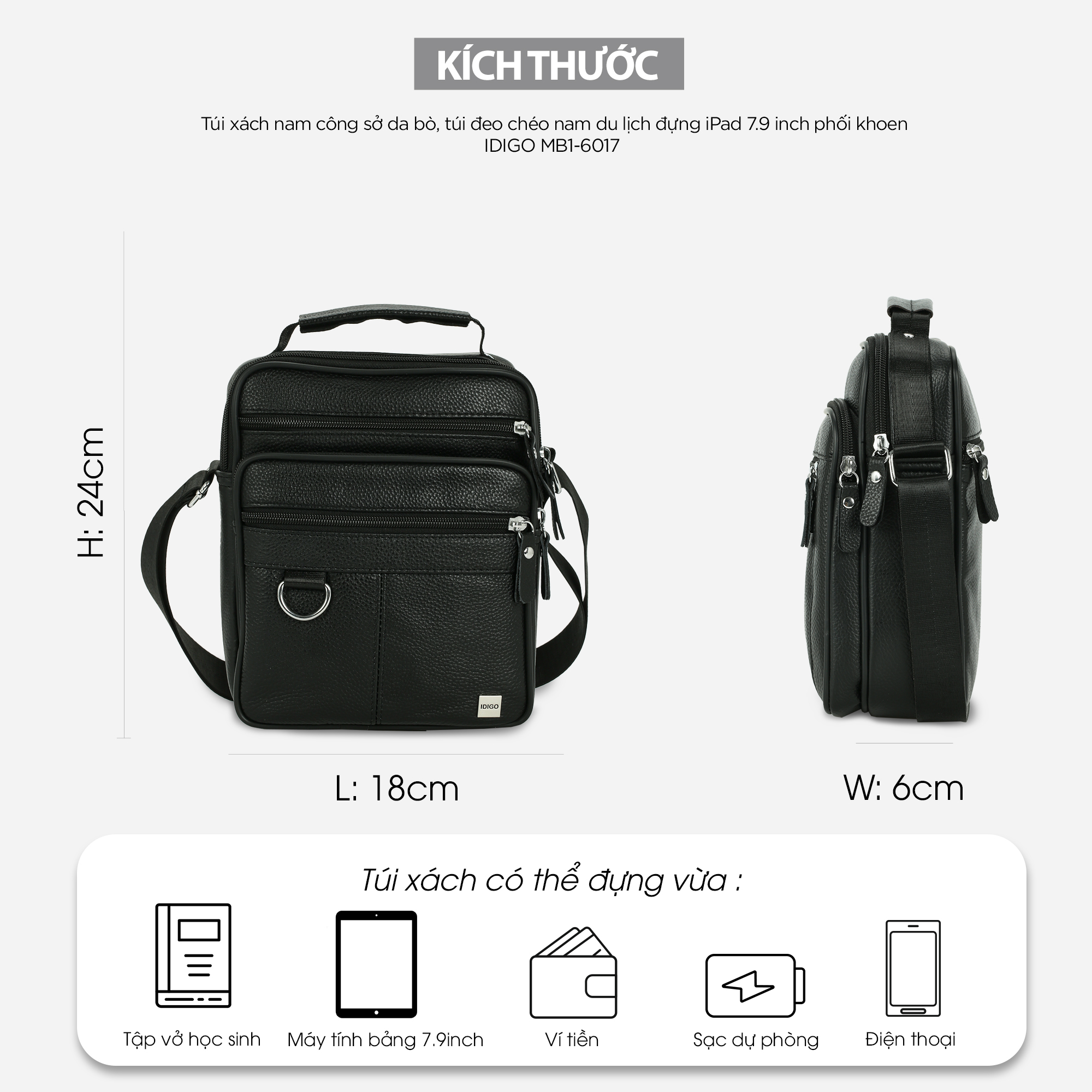 Túi xách nam công sở da bò, túi đeo chéo du lịch đựng iPad 7.9 inch phom ngang IDIGO MB1 - 6020