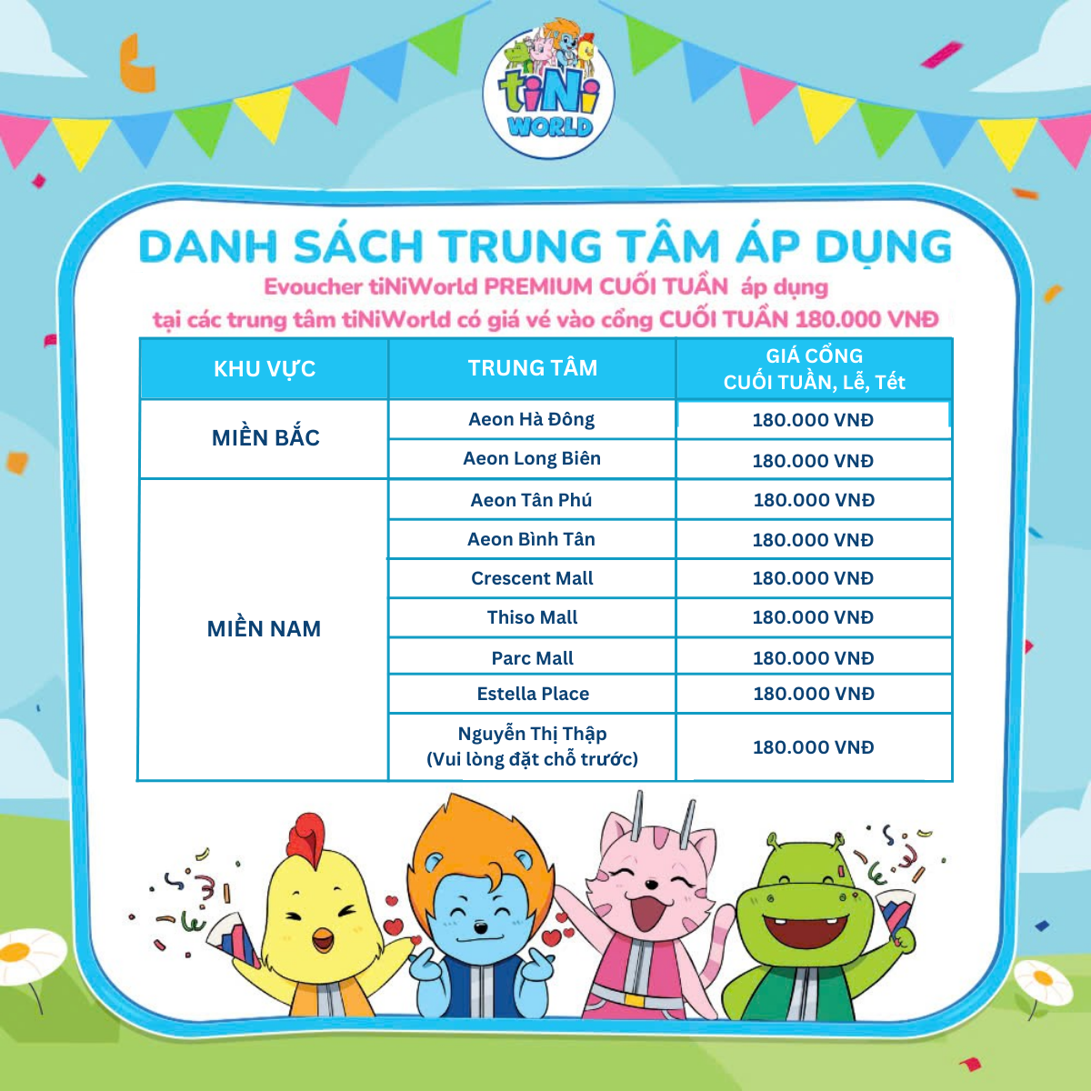✨Vé vào cổng điện tử tiNiWorld PREMIUM CUỐI TUẦN/LỄ áp dụng tại các trung tâm tiNiWorld có giá vé vào cổng 180.000 VNĐ