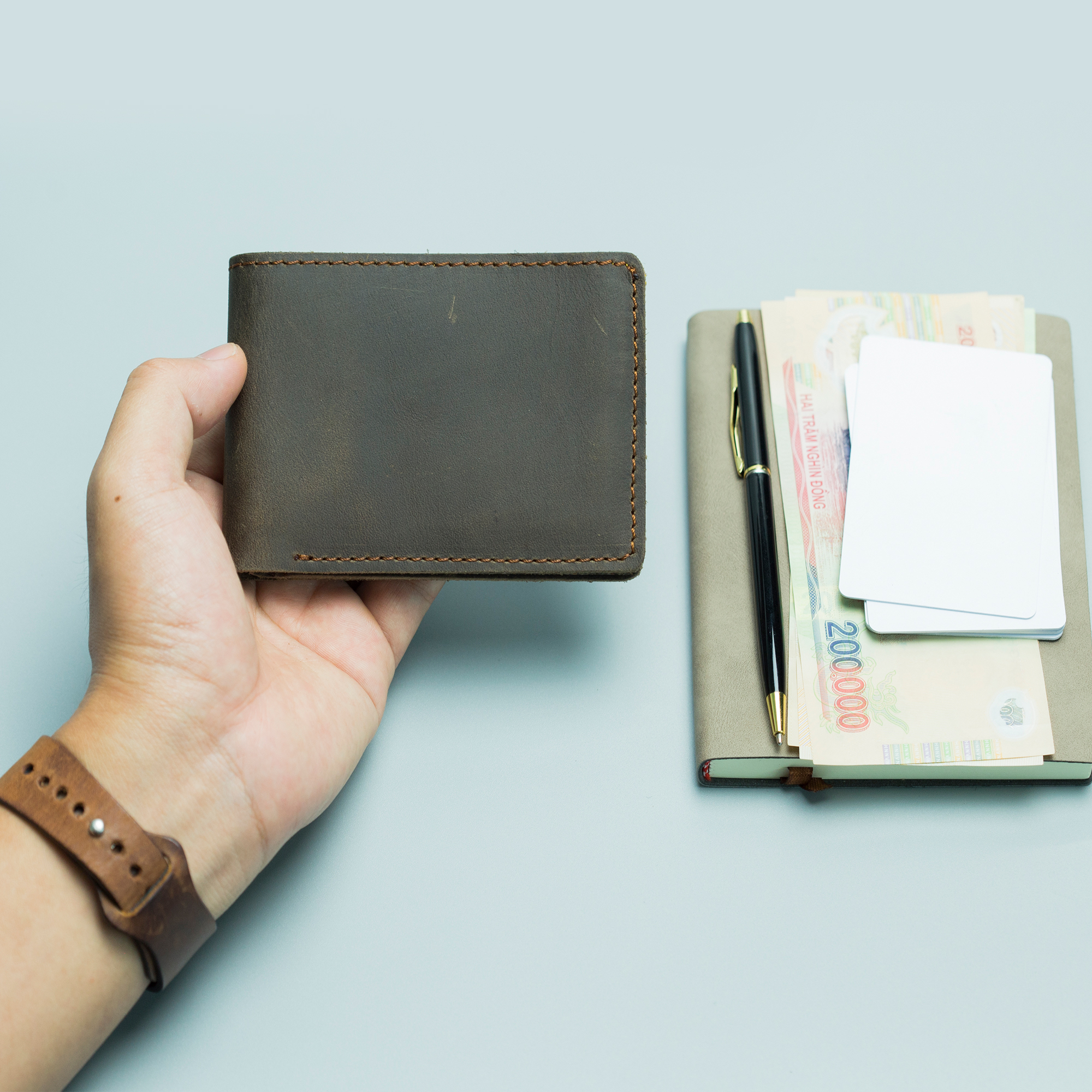 Ví Nam da bò sáp ngựa điên Crazy Horse khâu tay thủ công, Da bò sáp nguyên tấm nhập khẩu Italia