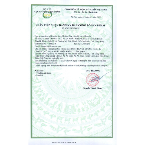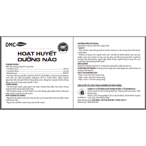 Viên uống HOẠT HUYẾT DƯỠNG NÃO được sản xuất bởi Công ty CP Xuất Nhập Khẩu Y tế DOMESCO đã đạt công nhận về tiêu chuẩn Thực hành tốt Sản xuất Thực phẩm Bảo vệ