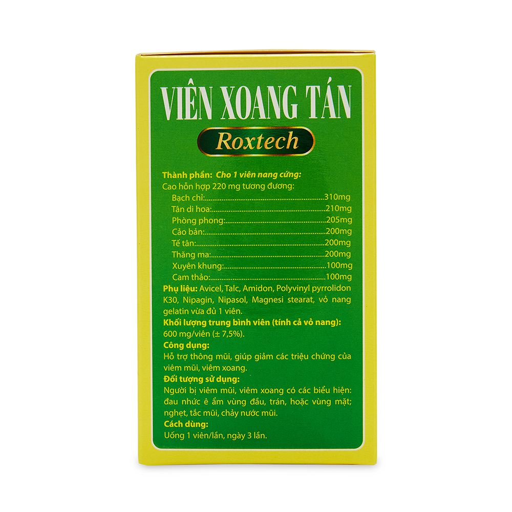 - Có tác dụng làm giảm các triệu chứng khi cảm cúm nhẹ. THÀNH PHẦN CỦA VIÊN XOANG TÁN ROXTECH