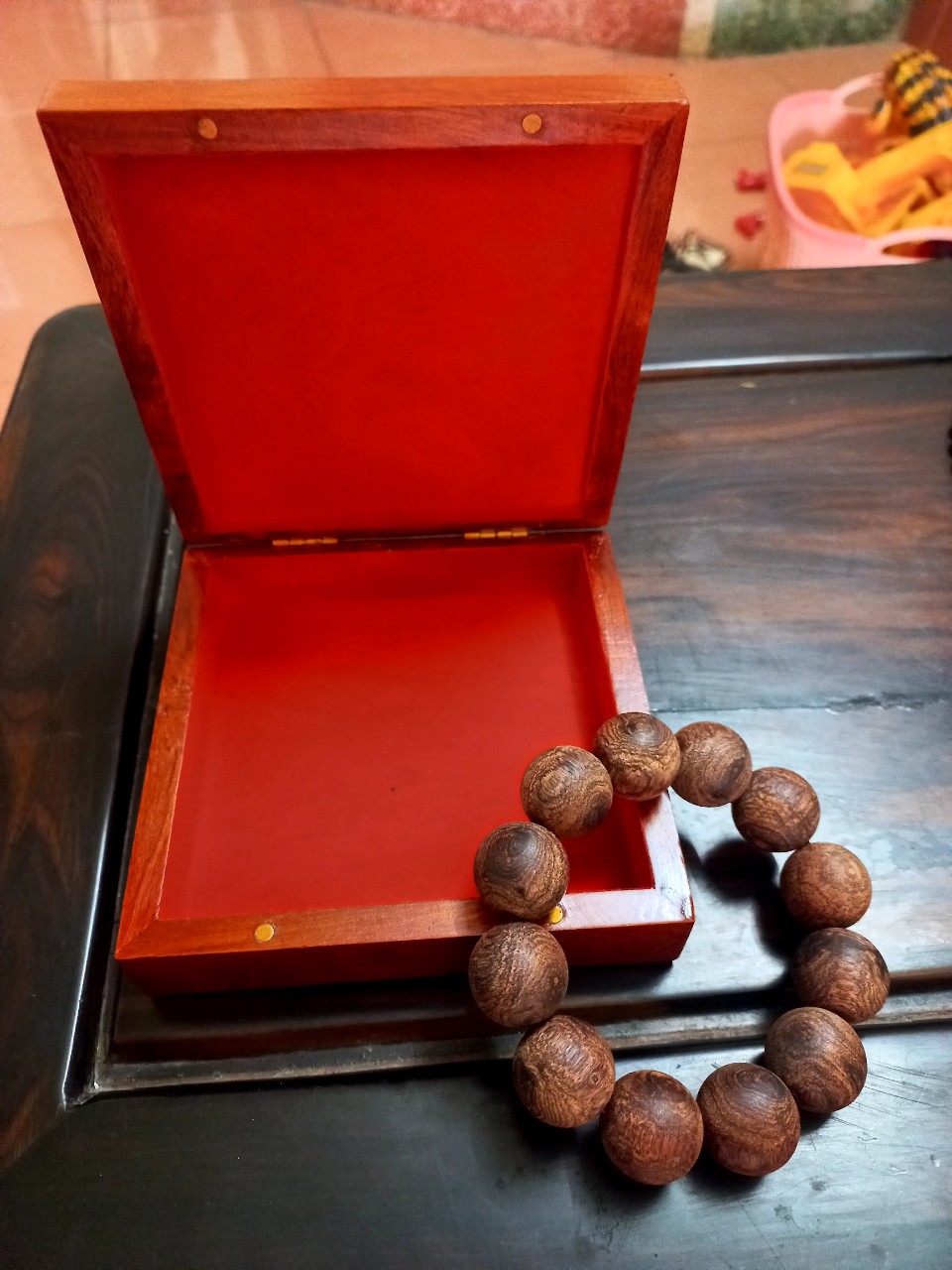 Vòng gỗ sưa đỏ  vòng đeo tay trang sức phong thủy được làm bằng chất liệu gỗ sưa đỏ tự nhiên 100%  Kích thước vòng 20ly + hộp đựng trang sức bằng gỗ hương cao cấp kt 13×13×4cm  _ Vòng gỗ sưa đỏ được gắn kết với phật ,cho nên nó mang tính lành ,Không cần dựa vào cung mệnh ,Tất cả mọi người ai ai ,cũng có thể đeo được ,Ngoài ra vòng gỗ sưa ,còn rất tốt với sức khỏe ,bởi mùi hương thơm lành tính của gỗ ,Giúp hoạt huyết tốt ,cho những người bị tim mạnh ,dạ dầy hay huyết áp cao .Bên cạnh những lợi ích vòng gỗ sưa đem lại về sức khỏe ,nó còn giúp tinh thần thoải mái ,Và là vật phong thủy không thể thiếu ,đối với những người làm ăn kinh doanh ,cũng như quan chức ,và những người có địa vị trong xã hội ,thành đạt ,.Đều muốn sở hữu riêng cho mình một sản phẩm về gỗ sưa ,Đặc biệt vòng đeo tay ,Vì theo quan niệm sưa,cũng như nhiều đời kể lại vòng gỗ sưa nó có tác dụng xua đuổi tà ma ,và những luồng khí xấu ,giúp người đeo an toàn tài lộc may mắn thịch vượng _Hơn thế nữa vòng gỗ sưa rất bền và cứng ,nên bạn có thể đeo thoải mái ,mÀ không sợ vòng bị trầy sước ,sứt sẹo hay mục