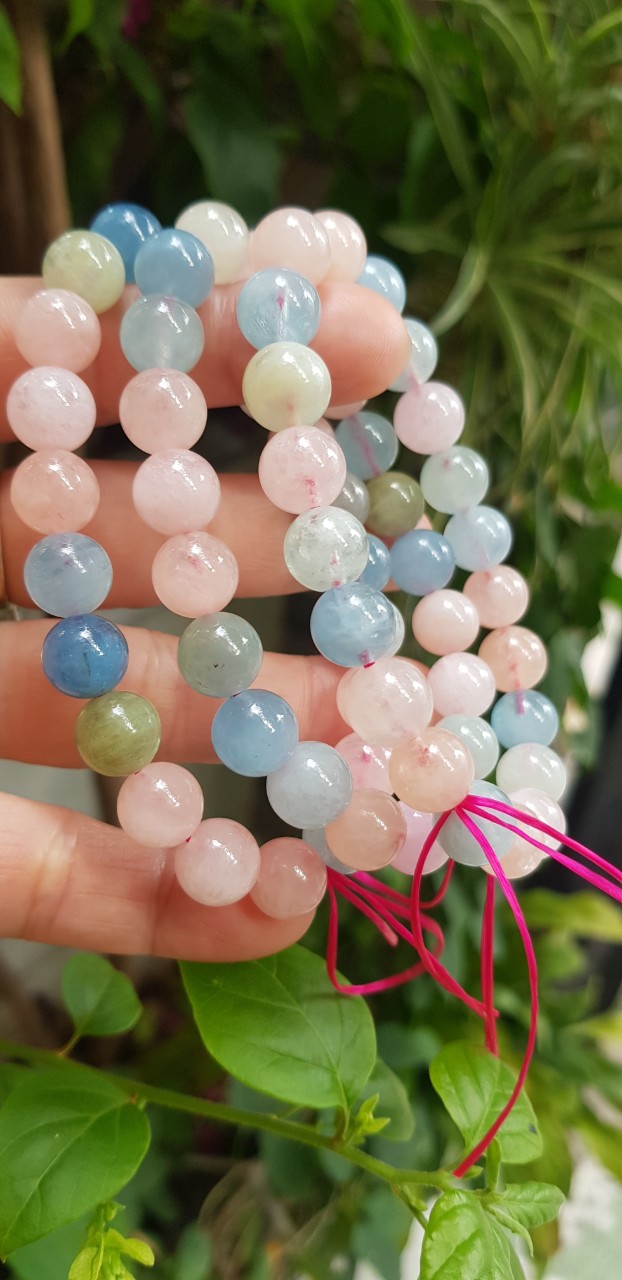 Vòng tay chuỗi đá Beryl tự nhiên đa sắc màu tươi sáng bóng mượt đẹp size hạt 9mm là sự phối hợp tông màu hồng ngọt ngào với xanh dương xanh nước biển đậm nữ đeo tay đẹp xinh tay may mắn tốt cho sức khỏe công việc tài lộc