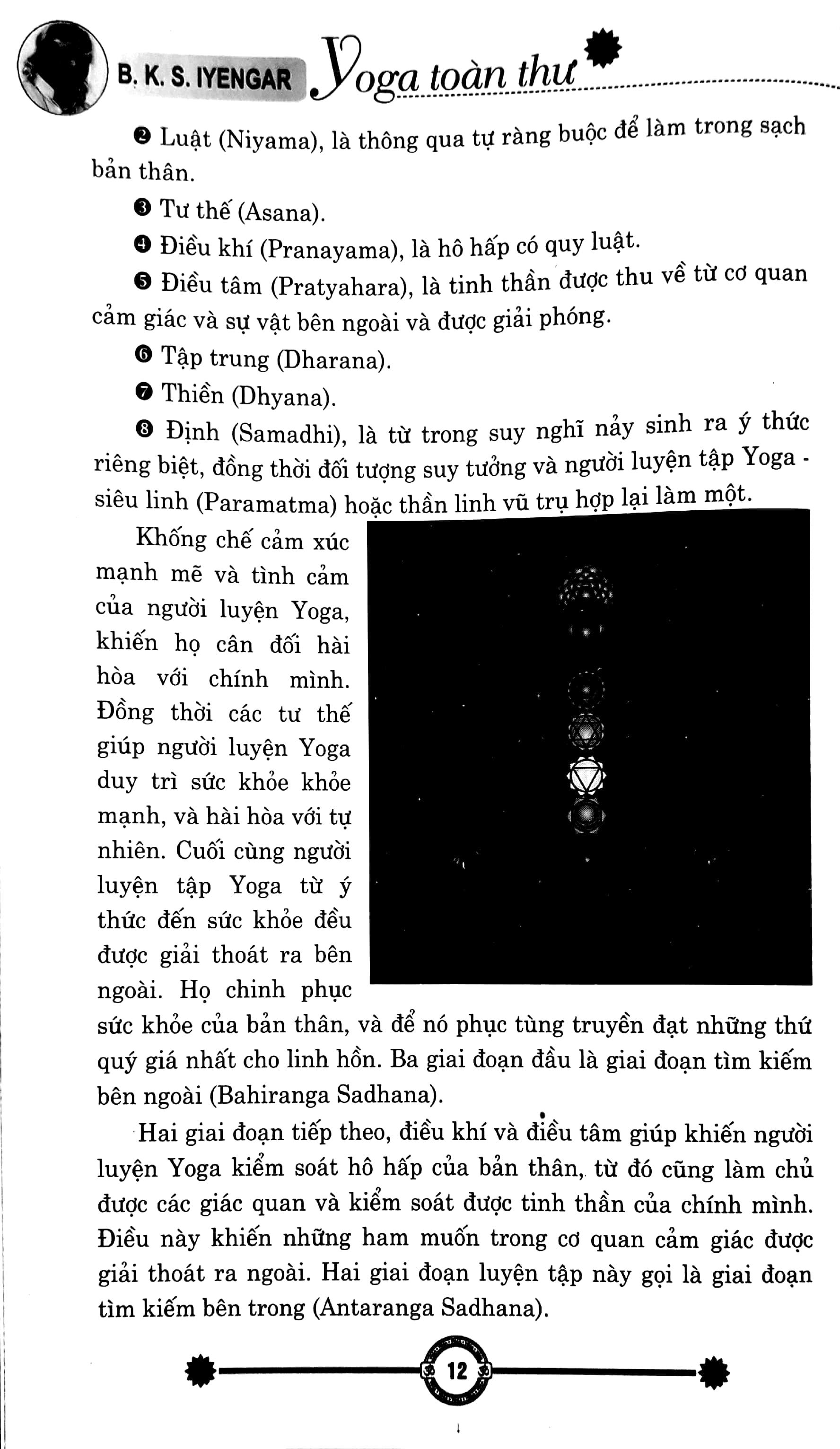 Yoga bao gồm 8 nhánh: Yama (Giới), Niyama (Luật), Asana (Tư thế), Pranayama (Điêu khí), Pratyahara (Điều tâm), Dharana (Tập trung), Dayana (Thiền), Samadhi (Định); cùng một hệ thống lên tới 50.000 tư thế khác nhau.